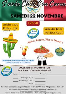 L’amicale villageoise de Blameré nous communique sa prochaine soirée à thème le samedi 22 novembre à 19 h30 ! Soirée Chili con carne Réservez vite vos places AVANT LE 17 NOVEMBRE! A diffuser svp.