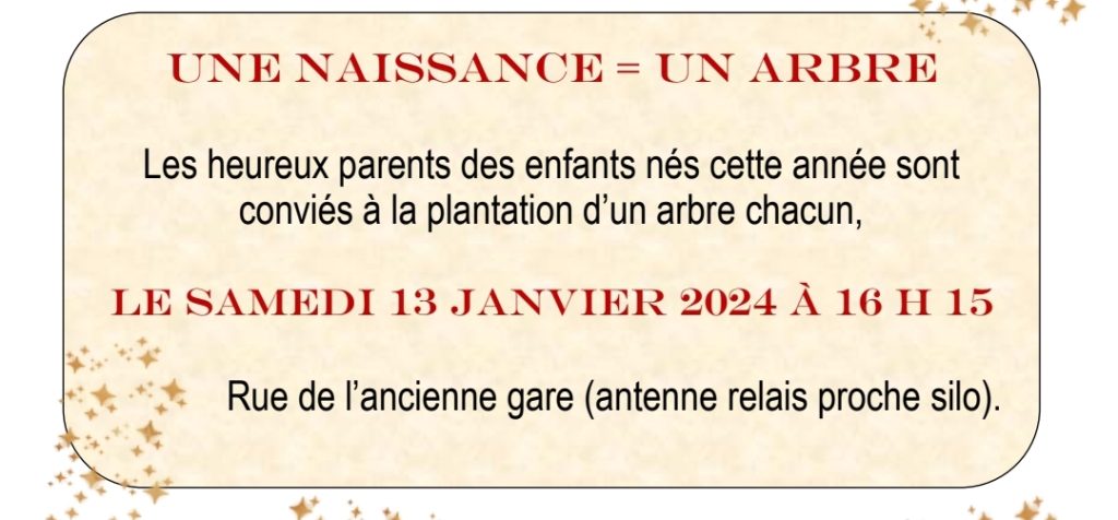 Comme chaque année et avant les vœux du maire, venez encourager les parents concernés par les plantations des arbres pour leurs enfants nés en 2023.